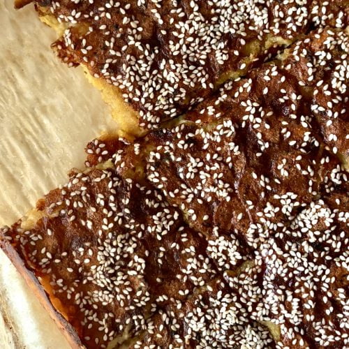 • Смесата ставете ја во тава врз хартија за печење, наросете сусам и сув магдонос по желба.