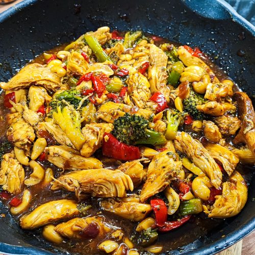 - Кога ќе биде пропржен зеленчукот, стави индиски ореви, додади го пилешкото и на крај сосот. Мешај додека сосот се згусне.