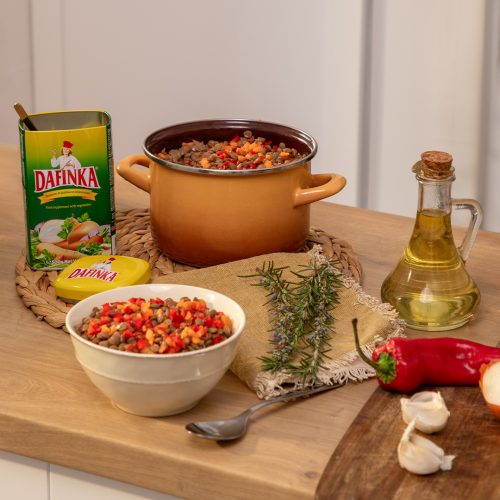 • Потоа додадете ги Дафинка леќата, исецканиот домат и зачинете со Дафинка зачинот, црвена пипер, буковец и сол.